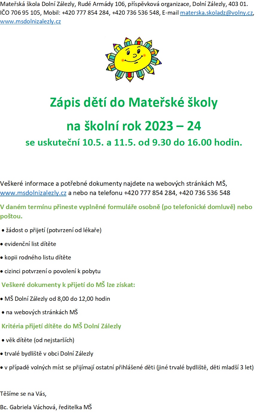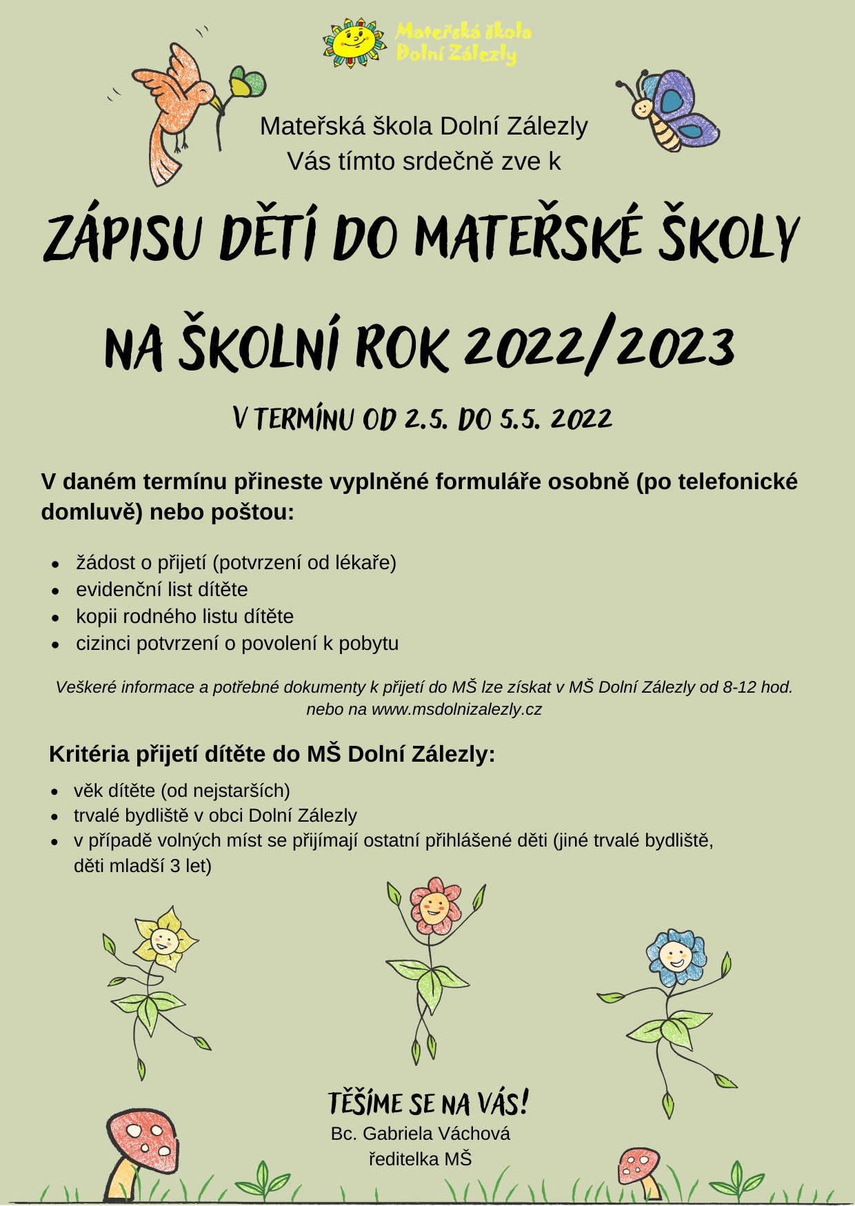Zápis dětí do MŠ Dolní Zálezly na školní rok 2022 - 2023 se uskuteční od 2.5. do 5.5. 2022 .